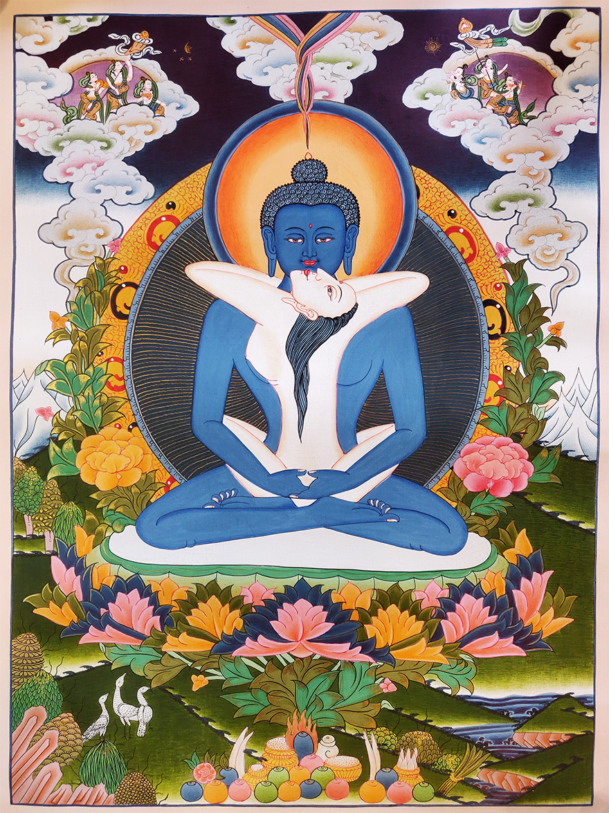In this thangka painting Samantabhadra is depicted embracing his consort Samantabhadri in Yab-Yum, the sacred union.