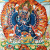 Vajrabhairava is surrounded by red and orange flames symbol of pristine awareness. On each side of the lotus throne skull cups are filled with various offerings.